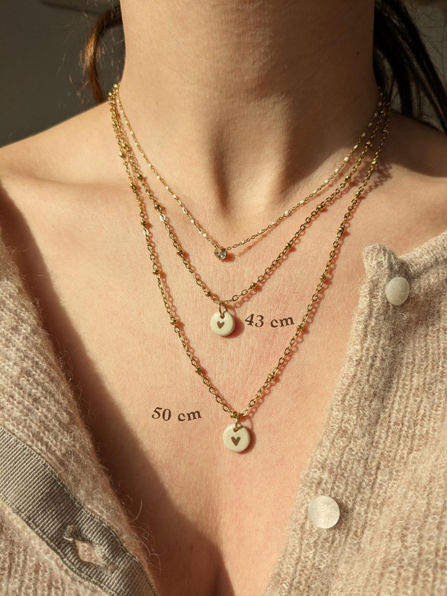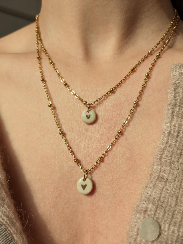 Ce collier délicat se compose d’une chaîne perlée en acier inoxydable doré, résistante et élégante, et d’une médaille en grès blanc, façonnée à la main, ornée d’un mini cœur marron – signature discrète et pleine de sens de ma marque.